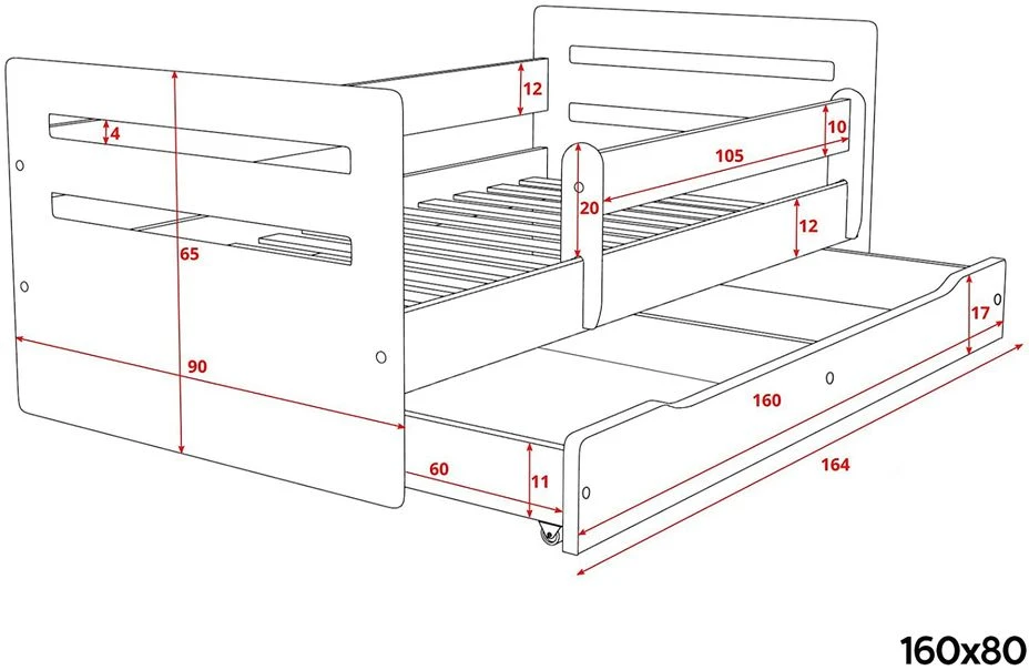 160x80cm – L 164 x P 90 x H 65 cm
