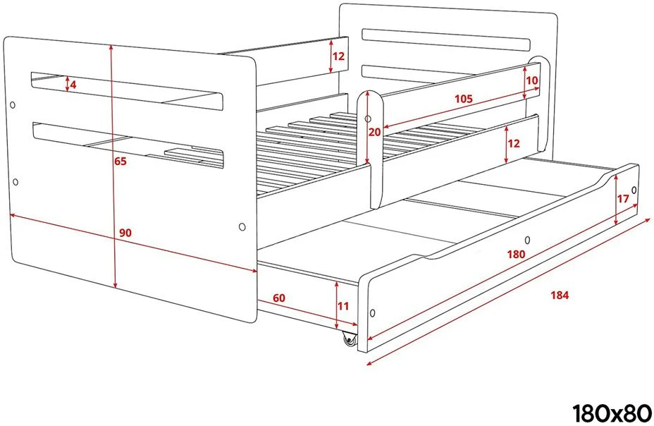 180x80cm – L 184 x P 90 x H 65 cm
