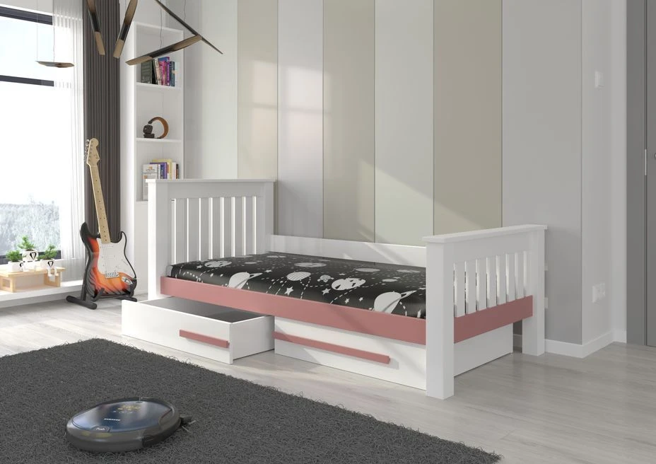 Fabriqué avec soin en bois de pin vernis blanc mat et rose robuste et esthétique.nous utilisons des vernis écologiques, peints au pistolet, pour protéger le lit. Grâce à trois couches de vernis appliquées avec précision, notre lit garantit une résistance exceptionnelle aux dommages mécaniques et à divers types de salissures.