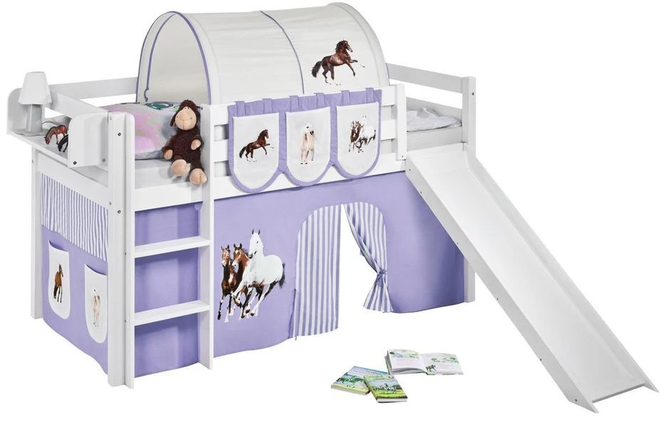 Lit Mezzanine Blanc Avec Toboggan Et Rideau Beige Et Parme Chevaux 90×190 Cm