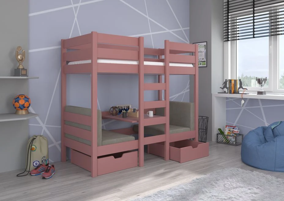 Offrez à votre enfant un espace de rêve avec notre lit superposé et mezzanine combiné bois rose avec 2 fauteuils confortables avec un revêtement en velours gris foncé, conçu pour allier confort, fonctionnalité et sécurité. Le lit dispose d’un espace de couchage spacieux de 90×200, offrant à votre enfant une nuit de sommeil reposante. Les dimensions extérieures du lit sont de 208x97x170, parfaitement adaptées aux chambres de toutes tailles.