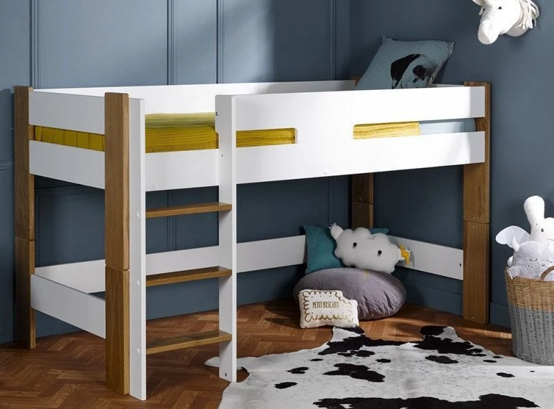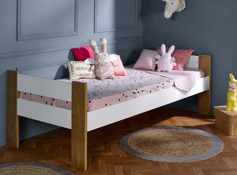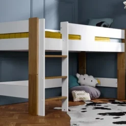 Fabriqué en bois MDF blanc avec des pieds en hêtre massif clair, sa structure est solide et durable, vous pouvez d’abord le monter en lit simple sans les rehausses mi-hauteur.