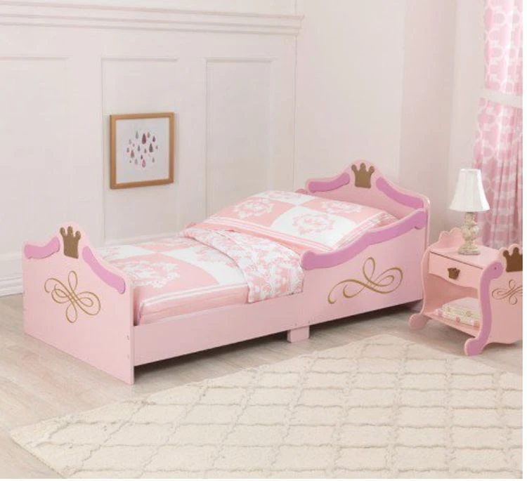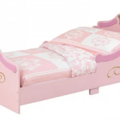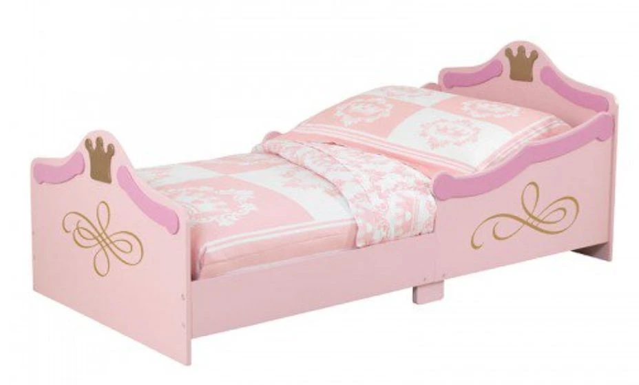 Suffisamment bas pour offrir un accès facile pour les enfants, ce lit en bois rose de la collection Princesse est décoré de couronnes.