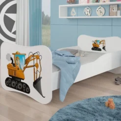 Lit Enfant Bois Blanc Imprimé Pelleteuse 70×140 Ou 80×160 Cm – Sommier Et Matelas Inclus – Ondula